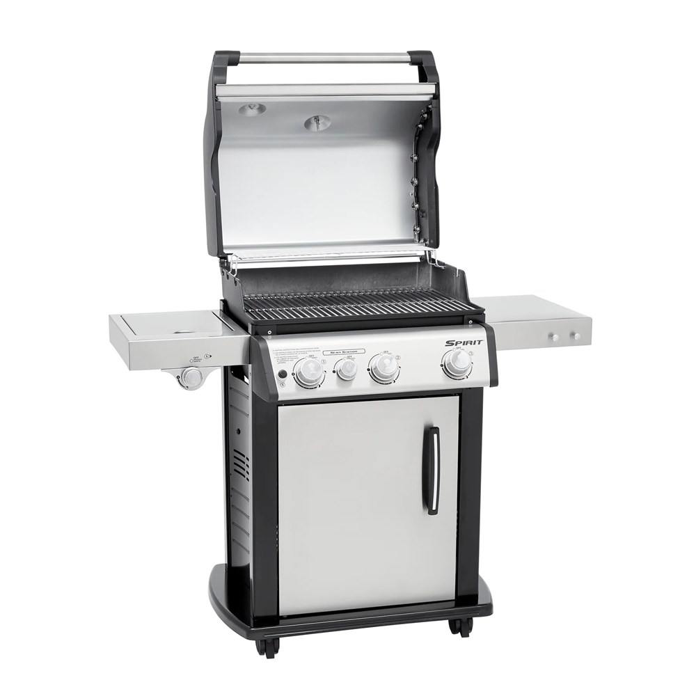 The Spirit SP-335 gas grill has a front-mounted control panel containing three stainless-steel burners and an improved electronic ignition system. These three high performance burners produce 30,000 BTUs of power, with a total cooking area of 529 square inches (424 square inch primary cooking surface and a 105 square inch warming rack). The Spirit S-Series of grills also come with a Stainless-Steel shroud with a built-in thermometer, a stainless steel door for an enclosed cart. Even more, this unit has two side tables, six tool hooks, and two large heavy-duty wheels. This grill requires a propane tank to operate (Not Included). The grill measures 44.5 inches high by 52 inches wide by 27 inches deep.
